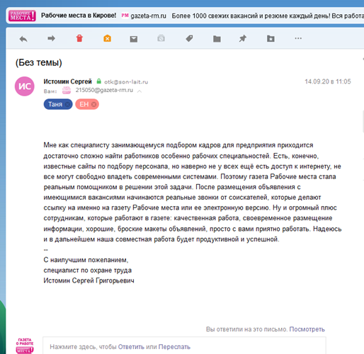 С газетой «Рабочие места» работать легко, эффективно, и очень приятно! За период сотрудничества с газетой у нас сформировались дружеские отношения. Конечно, за это огромное спасибо сотрудникам газеты, которые отзывчиво относятся к клиентам, всегда рады помочь и подойти к клиенту так, как будто он единственный, а это в современных рыночных отношениях очень важно.